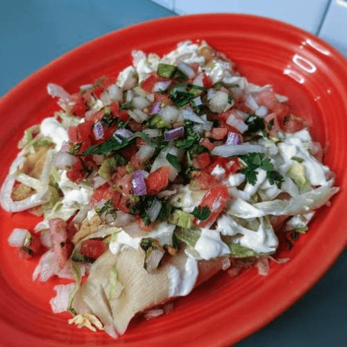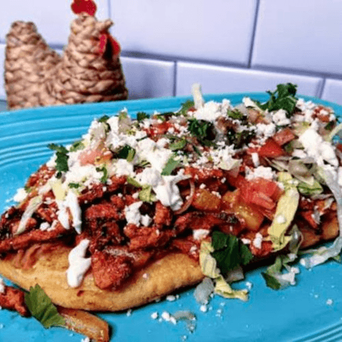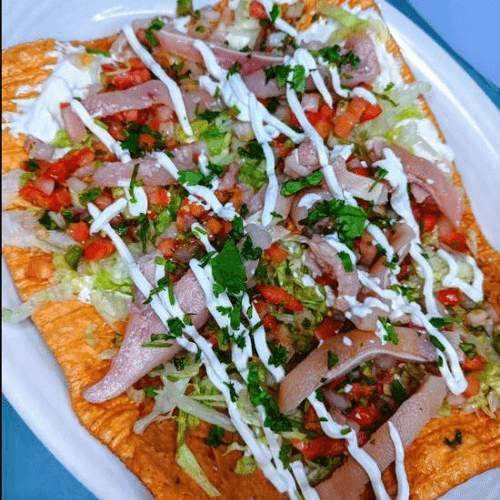 A fried masa layer topped with meat, beans, lettuce, pico de gallo, sour cream and queso fresco
