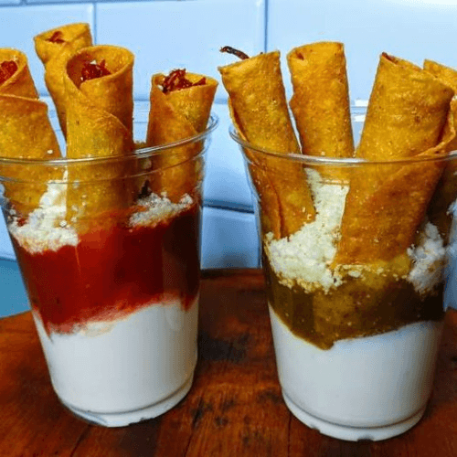 4 rolled tacos filled with chicken or potato. Served in a cup with sour cream, salsa, and crumbled queso fresco