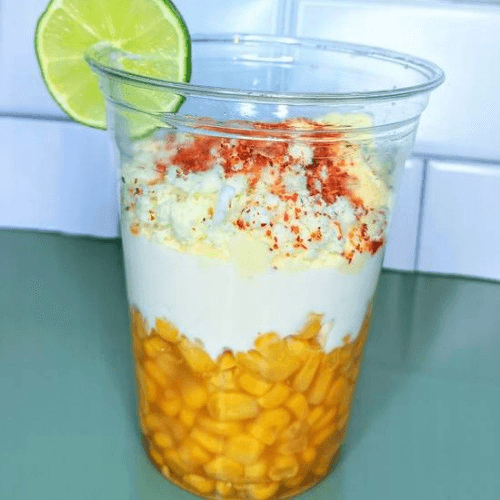 Corn layered in a cup with mayo, crema, queso fresco, and chili lime seasoning