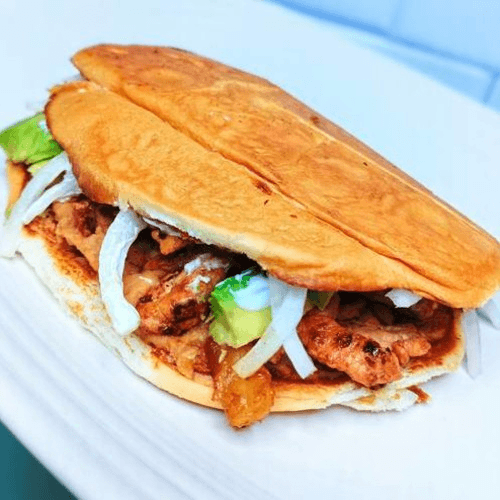 Panini bread stuffed with meat, beans, sour cream, mayo, pickled onions, melted cheese, tomato, and avocado