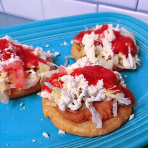 A fried masa disk topped with meat, beans, lettuce, tomato, sour cream, and queso fresco