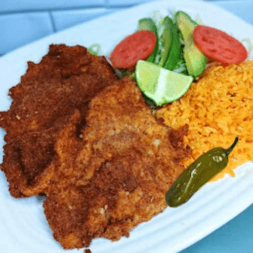 Breaded chicken breast or steak served with rice, lettuce, tomato, avocado, and a pickled jalapeño